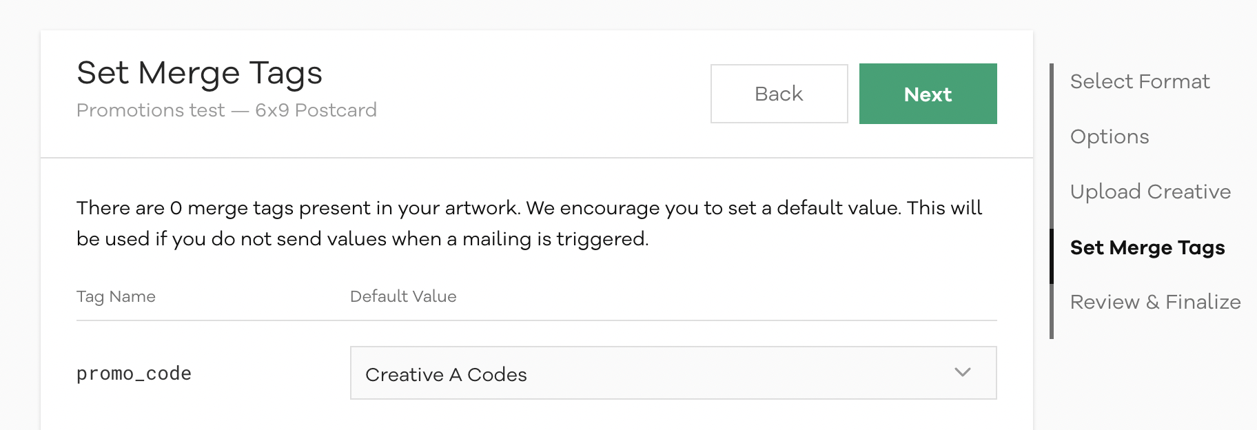 You **must** complete these steps prior to uploading creative, so a promotion list can be selected to map to a merge tag.&#x20;