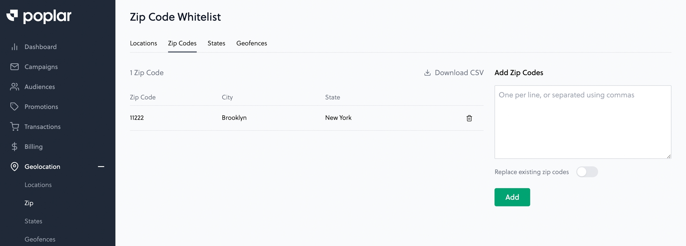 From the Geolocation page, navigate to the Zip Codes tab. Click "Add", then, type or paste zip codes in the space provided below. One per line, or separated using commas.