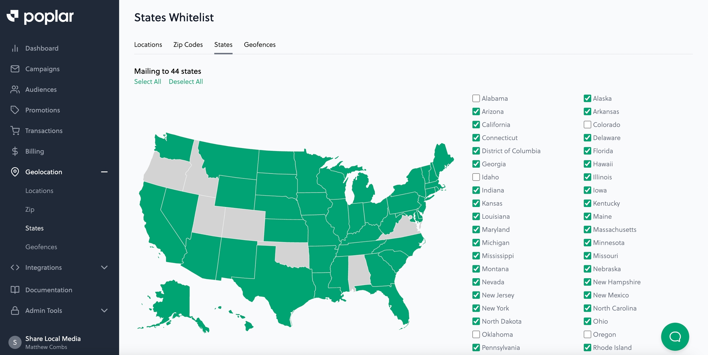 From the Geolocation page, navigate to the States tab. Select only the states you wish to mail.