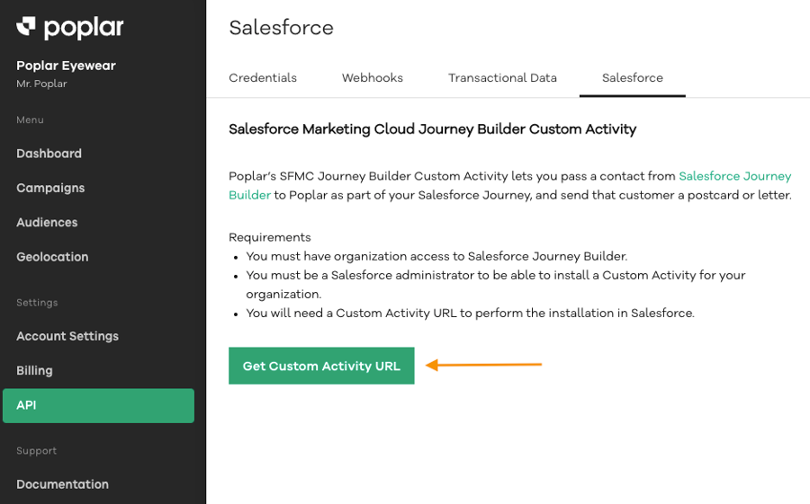 Navigate to the API page of your Poplar account and click Get Custom Activity URL under the Salesforce tab: