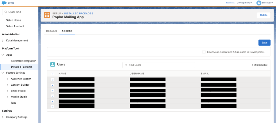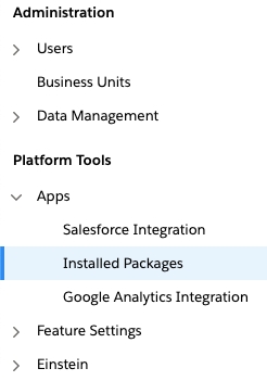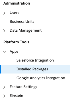 Log into Salesforce Marketing Cloud and hover over your profile icon to access Settings > Setup. Under the left-hand navigation, click into Platform > Apps > Installed Packages: