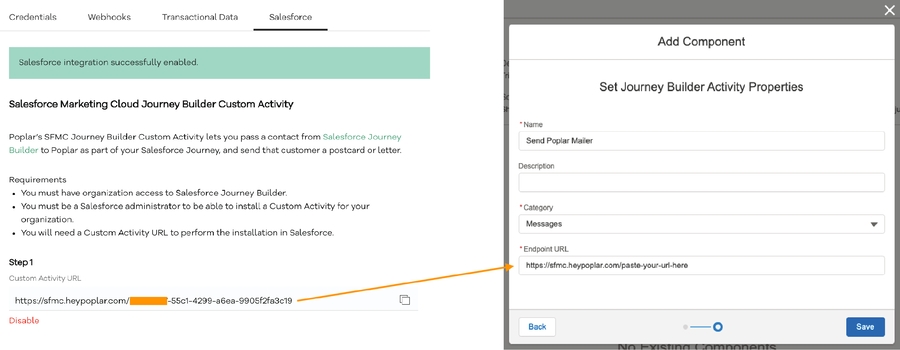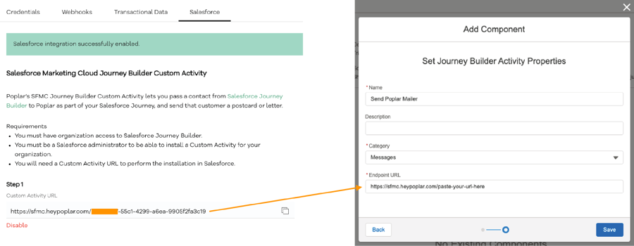 Set your Journey Builder Activity Properties with a recognizable name and Messages as the Category. Then head back to Poplar to copy your Activity URL and paste it into the Endpoint URL field:
