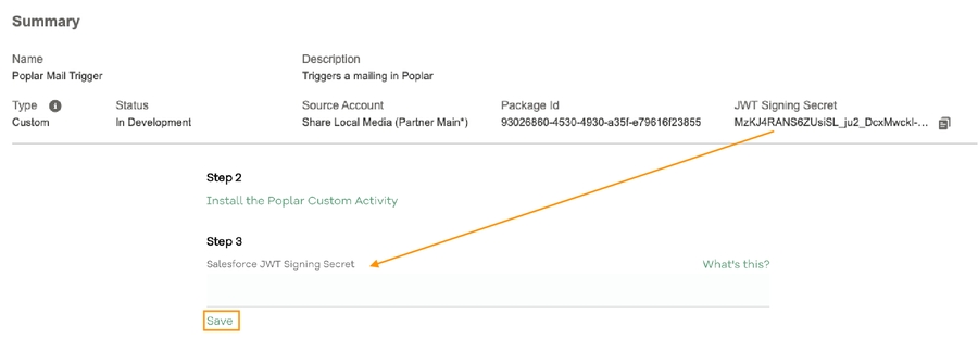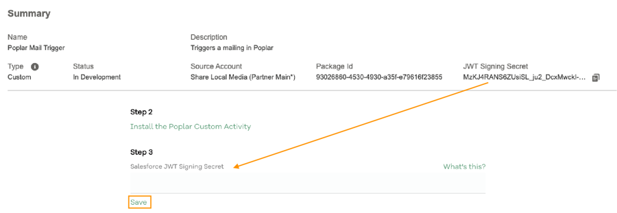 This is a secret generated by Salesforce pertaining to the Custom Activity that you've just installed. Salesforce sends over this secret every time it sends information to the Custom Activity, in our case, sending recipient information to trigger a mailing in Poplar.