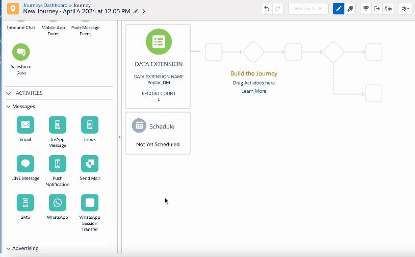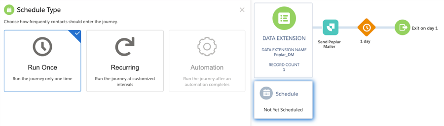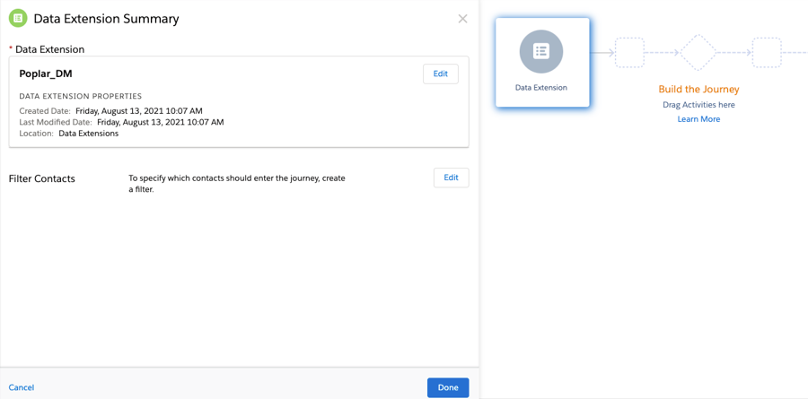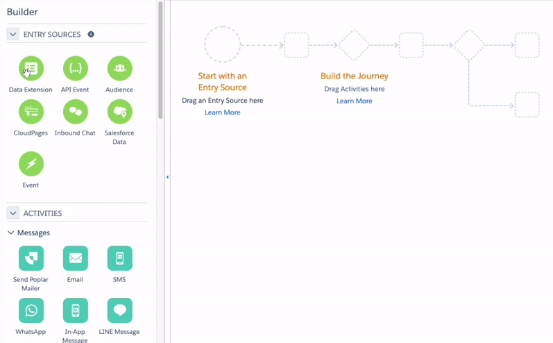 Other entry sources into journeys using the Poplar Custom Activity remain untested. If you are interested in leveraging other entry sources, let us know at [email protected]. You can also contact your Salesforce Account Executive for help on finding out how to reference your specific dataset in the journey.