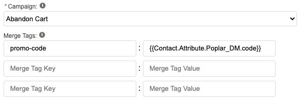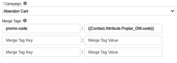 To map the SFMC code attribute data to the {{custom.promo-code}} merge tag in your Poplar creative, you'd want to set the Merge Tag Key to promo-code and the Merge Tag Value to {{Contact.Attribute.Poplar_DM.code}} as pictured below: