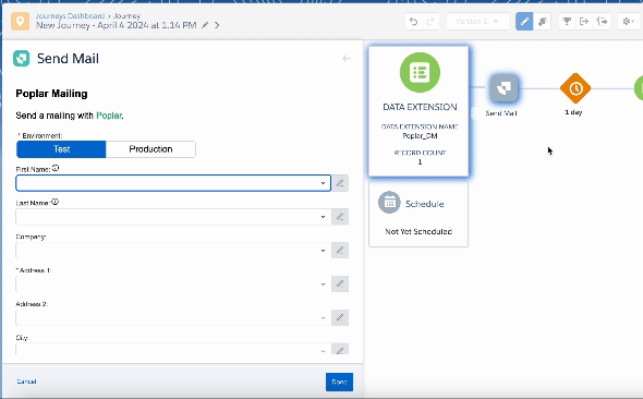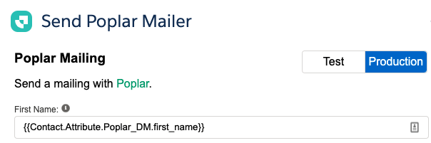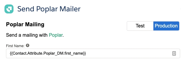 Now that you've installed the Poplar Custom Activity, it's time to use it in a journey! While building your Journey, you'll see the option to switch between Test and Production in Step 5 - we highly recommend starting in a Test environment so you can fire the trigger without actually sending any mailers.