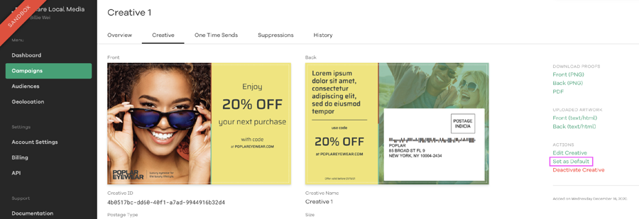 To set a creative as the default, click Set As Default when you click into the creative.
