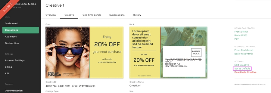 You don't need to specify a creative in your Salesforce config. Rather, you will manage all creative rules in Poplar. The Poplar Custom Activity will randomly use an active creative in your selected campaign according to the following rules: