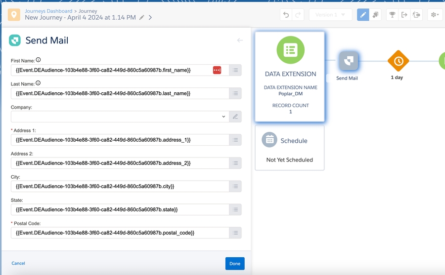 Poplar’s Custom Activity lets you pass a contact from Salesforce Journey Builder to Poplar as part of your Salesforce Journey, and send that customer a postcard or letter.